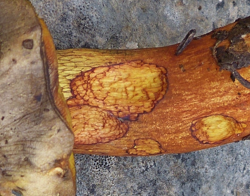 הנקבוביות בתחילה צהובות, עם הזמן מקבלות צבע חלודי. הצינורות צהובים-לימוניים, לאחר-מכן צהובים-זיתיים, מכחילים בלחיצה.