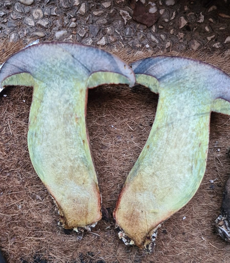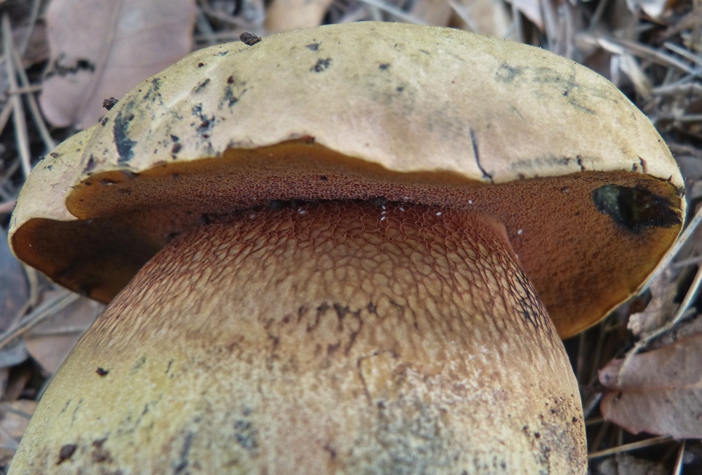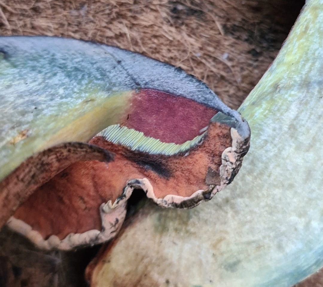 הנקבוביות קטנות, עגולות, צבען בתחילה אדום-כתום, אדום, אחר-כך חום-אדום, המכחיל בשפשוף. שכבת הצינורות בתחילה צהובה, אחר-כך צהובה-זיתית או צהובה-ירוקה, מכחילה בשבירה ובחתך.