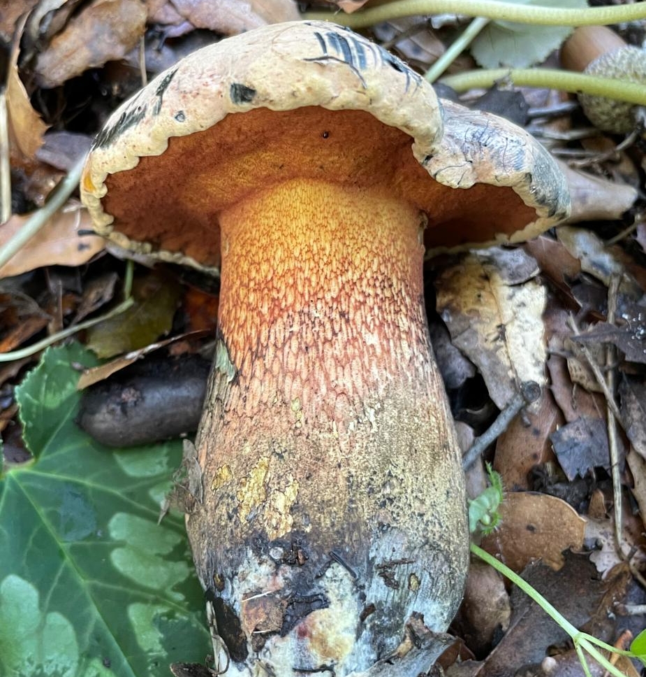 הרגל מרכזית, גלילית, עבה מאוד בגיל צעיר, תפוחה באמצע, צרה דמויית שורש בבסיסה, גובהה 7-15 ס"מ ועוביה 2-6 ס"מ, צבעה צהוב, צהוב-תפוז, צהוב-זיתי או תפוז-אדום ובבסיסה ארגמני, ייני, או חום-אדום, מכחיל בשפשוף. על פניה רשת ברורה בעלת תאים מאורכים בצבע חום-אדום.